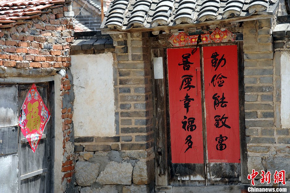 “神舟十号”即将发射,媒体纷纷报道来自烟台的王亚平,将成为第二位飞向太空的中国女航天员。中新网记者近日探访了王亚平家乡,追寻王亚平儿时与少年时的生活。驱车从烟台市福山城区沿福桃路向西南方向行驶20公里来到福山区张格庄镇,该镇有“中国大樱桃第一镇”之称,是中国最大的大樱桃集散中心。图为王亚平家的已经斑驳的木门上鲜红的对联“善厚幸福多”、“勤俭能致富”十分醒目,门梁上还贴着一对“福”字。王娇妮摄