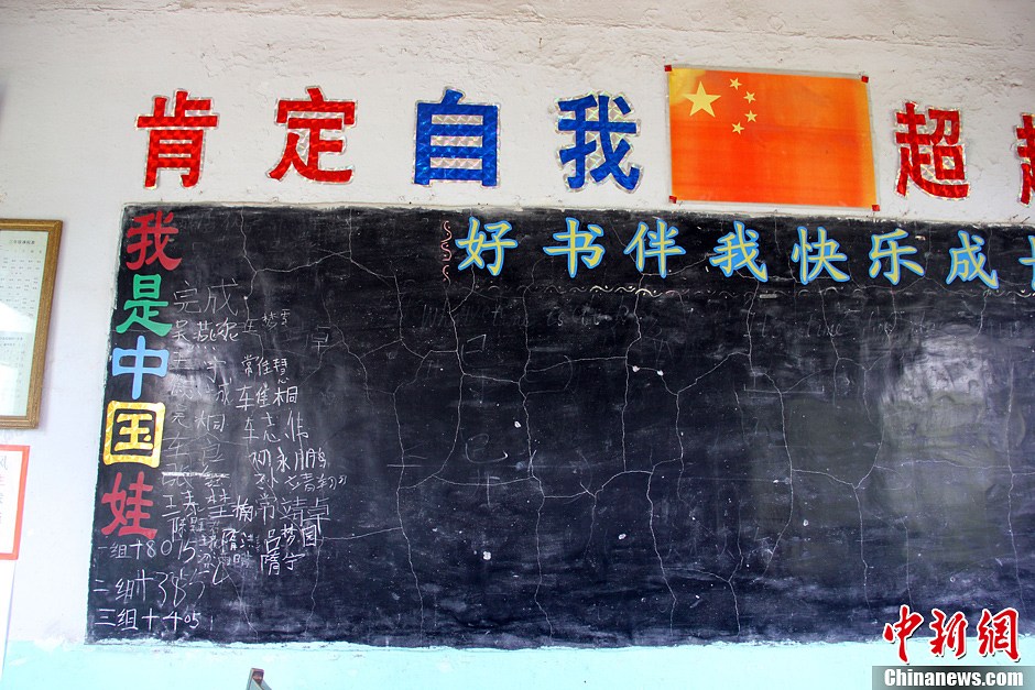 教室里贴着“我是中国娃”“奔向金色童年”等励志标语。王娇妮摄