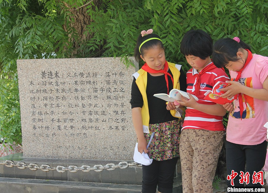 王亚平就读小学百年老树下的铜牌上记载着:“此树种植于宋庆元年间,历经沧桑,铁躯昂然,根深叶茂。千年百世,雄居于原山门之前。春叶绿,夏花黄,秋叶红,冬果紫。”王娇妮摄