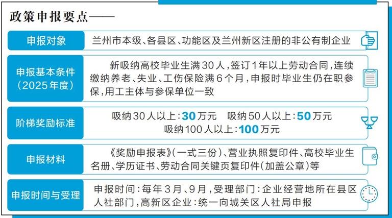 甘肃质量信用网3月3日讯 据兰州日报报道 近日,兰州市2026年度鼓励民营企业吸纳高校毕业生奖励申报工作正式启动。符合条件的民营企业,最高可获得100万元一次性奖励,政策红利持续释放。 据悉,根据《兰州市鼓励民营企业吸纳高校毕业生奖励实施细则》,在兰州市市本级、各县区、功能区及兰州新区注册的非公有制企业,2025年度新吸纳高校毕业生就业满30人,并满足以下条件即可申报奖励:一是企业与毕业生签订1年以上劳动合同,且连续缴纳养老保险、失业保险、工伤保险满6个月;二是申报时相关毕业生仍为企业在职参保员工;三是企业实际用工主体与参保单位保持一致。 奖励标准实行阶梯式发放:企业新吸纳高校毕业生30人以上的,给予30万元一次性奖励;50人以上的,给予50万元一次性奖励;100人以上的,给予100万元一次性奖励。 企业申报需提交《兰州市鼓励民营企业吸纳高校毕业生奖励申报表》(一式三份)、营业执照复印件、高校毕业生名册、学历证书及劳动合同关键页复印件(加盖公章)等材料。申报时间为每年3月和9月,由企业经营地所在县区人社部门受理,高新区企业统一向城关区人社局申报。 相关部门提醒,符合条件的企业应对照申报要求规范准备材料,抢抓政策机遇,具体事宜可咨询当地人社部门或登录兰州市人力资源和社会保障局官网查询。 记者 赵万山 实习生 邓苗慧