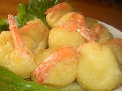 2、取一只虾仁,用土豆泥小心包裹起来,虾尾向上;