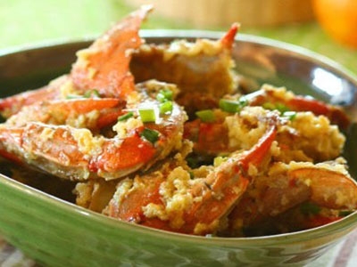 原料:母蓝蟹、大蒜、生姜、葱、鸡蛋、面粉、盐、糖、黑胡椒粒、水、油。