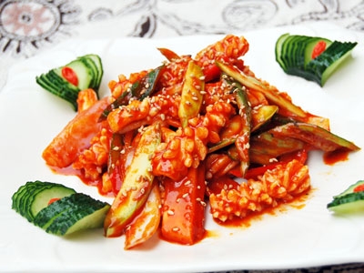材料:鲜鱿鱼1只、洋葱半个、蒜茸香辣酱1大匙、糖少量、熟芝麻适量、油1大匙