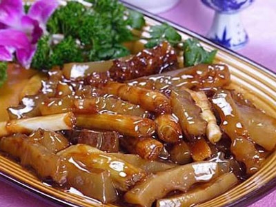 5.将炒锅置于旺火上,倒入糊葱油(30克),烧热后放入青蒜段和蒸好的葱段,略煸一下,撒在海参上,葱烧海参即成。