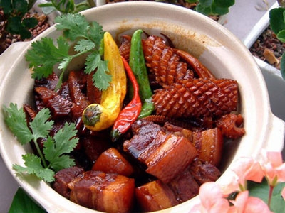 1、一大匙糖/一大匙油熬成褐色,放进五花肉/姜/蒜翻炒至上色,香气溢出,注入两饭碗清水,