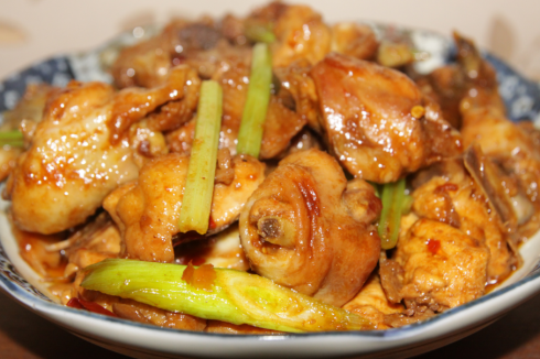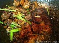 4:接着放入鸡肉加入其他调味料炒均匀以小火煮约5分钟至汤汁略收干再放入蒜苗及芹菜翻炒均匀即可
