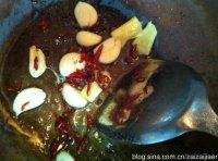 3:锅中留下适量的油以小火爆香蒜头、姜片、花椒、干辣椒再加入辣豆瓣酱炒香