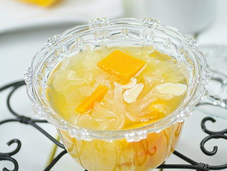 银耳(干)10克,百合(干)10克,粳米25克。银耳用水泡涨,百合、粳米洗净后同放入锅中,加水适量煮成粥,再加冰糖少许即可。