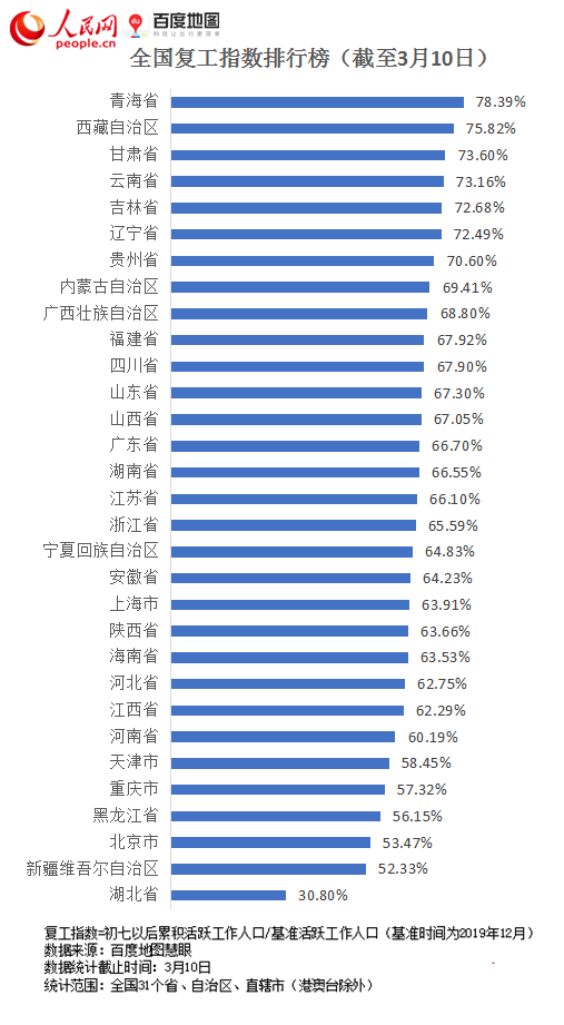 从统计数据来看,自2月23日习近平总书记重要讲话发布后,各地复工指数出现明显上涨,各省区市排名情况也发生了变化。截至3月10日,除湖北外,全国30省区市的复工指数均超过50% 。“复工指数”排名前10的省份依次为:青海、西藏、甘肃、云南、吉林、辽宁、贵州、内蒙古、广西、福建。其中,青海成为工作人口活跃度最高的省份,复工指数为78.39%。