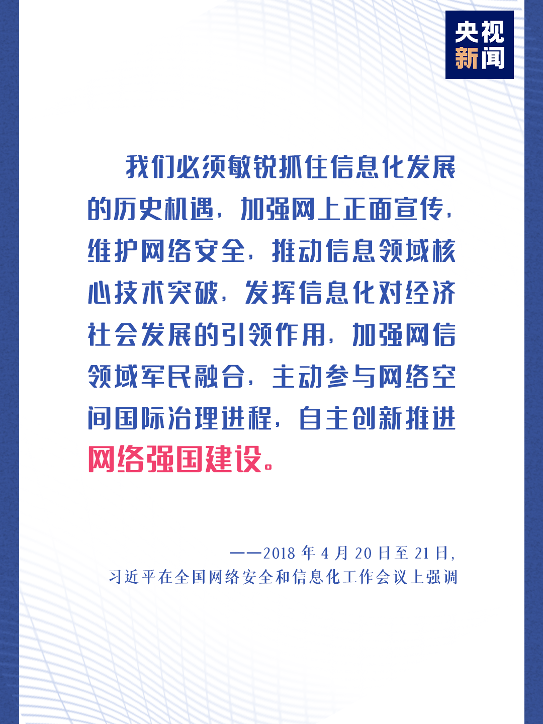 2018年4月20日至21日,习近平出席全国网络安全和信息化工作会议并发表重要讲话。