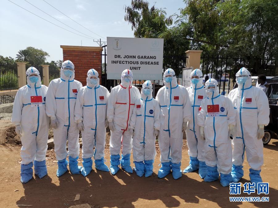 2020年8月21日,中国抗疫医疗专家组成员在南苏丹首都朱巴的一处新冠肺炎治疗机构留影。新华社发(中国驻南苏丹大使馆供图)
