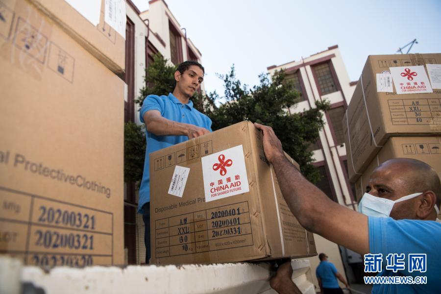 2020年5月10日,在埃及首都开罗,工作人员搬运中国政府援助的抗疫物资。新华社记者 邬惠我 摄