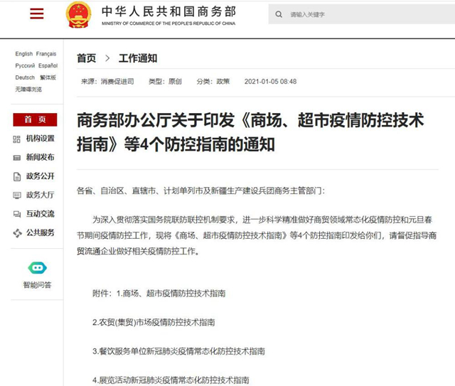 【甘肃质量信用网据商务部网站】1月5日,商务部网站发布《商场、超市疫情防控技术指南(第二版)》。《指南》在个人卫生防护方面提出,工作员工应加强个人防护,佩戴口罩、手套和着工作服上岗,做好手卫生;工作服保持干净整洁,定期清洗、消毒。禽畜肉类和熟食区从业人员还应当佩戴工作帽;生鲜宰杀等特殊摊位的经营者除工作服外,按防护要求需穿戴防水围裙、橡胶手套等。工作员工在物品交接传递时应当佩戴口罩和手套,避免直接接触。顾客不戴口罩时,应拒绝其进入商场、超市。乘电梯时要全程佩戴口罩。