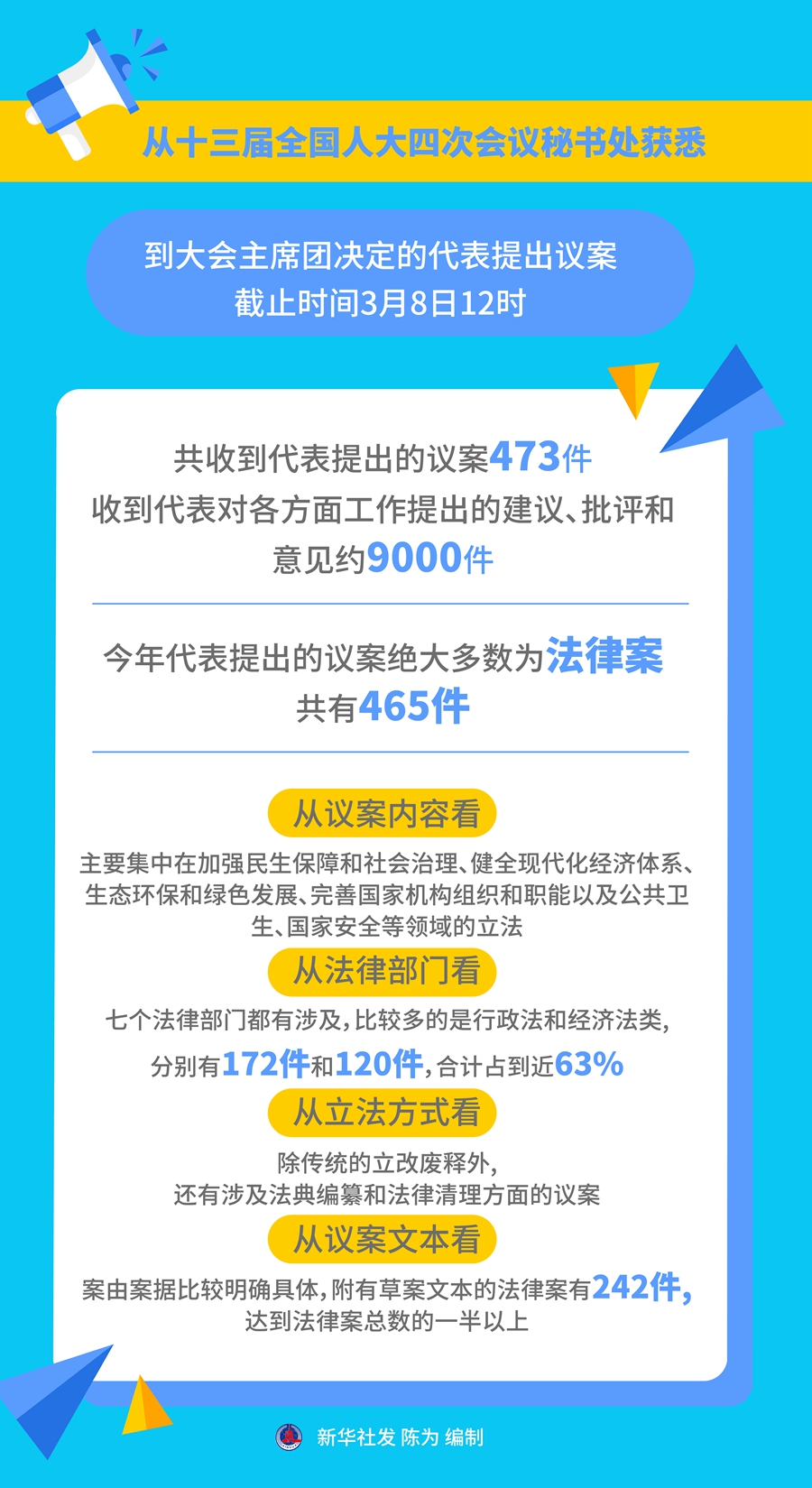 甘肃质量信用网据新华社北京3月9日电 记者9日从十三届全国人大四次会议秘书处获悉,到大会主席团决定的代表提出议案截止时间3月8日12时,大会秘书处共收到代表提出的议案473件。此外,目前收到代表对各方面工作提出的建议、批评和意见约9000件。