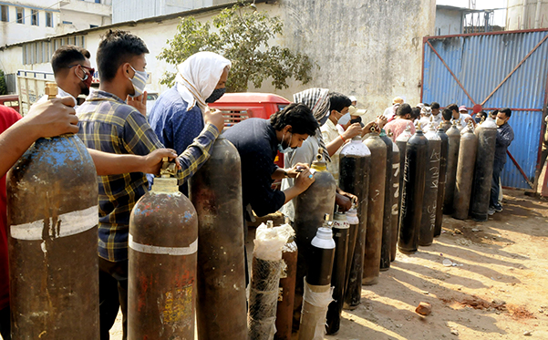 4月27日,民众排着长队,在印度巴特那等待为氧气罐充氧。新华社发