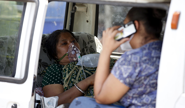 4月26日,由于床位紧缺,新冠患者在印度城市艾哈迈达巴德的医院接受救治时,只能躺在汽车内接受治疗。新华社发