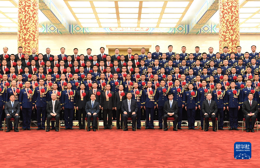 11月5日,党和国家领导人习近平、王沪宁、韩正等在北京人民大会堂会见全国应急管理系统先进模范和消防忠诚卫士表彰大会代表。新华社记者 谢环驰 摄