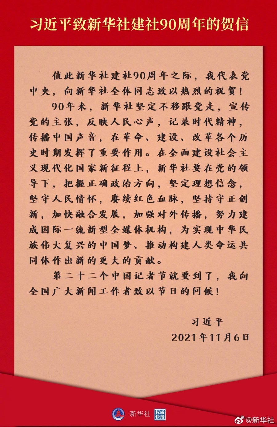 90年来,新华社坚定不移跟党走,宣传党的主张,反映人民心声,记录时代精神,传播中国声音,在革命、建设、改革各个历史时期发挥了重要作用。在全面建设社会主义现代化国家新征程上,新华社要在党的领导下,把握正确政治方向,坚定理想信念,坚守人民情怀,赓续红色血脉,坚持守正创新,加快融合发展,加强对外传播,努力建成国际一流新型全媒体机构,为实现中华民族伟大复兴的中国梦、推动构建人类命运共同体作出新的更大的贡献。