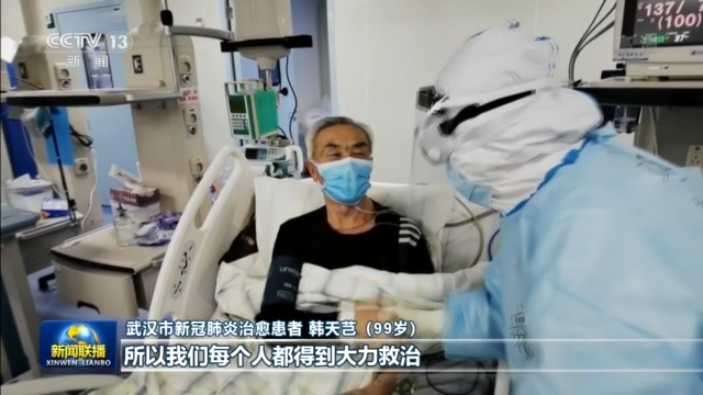 武汉市新冠肺炎治愈患者 韩天芑(99岁):上至百岁老人,下至初生的婴儿,每个生命都是重要的,所以我们每一个人都得到大力救治,这是我们中国人的骄傲。