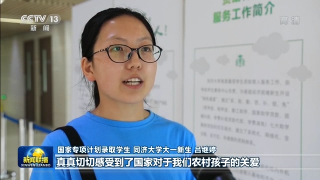 国家专项计划录取学生 同济大学大一新生 吕继婷:真真切切感受到了国家对我们农村孩子的关爱,之前申请了国家助学贷款,现在还可以申请学校的助学金和困难补助,也没有了后顾之忧。我一定好好学习回报国家的培养。