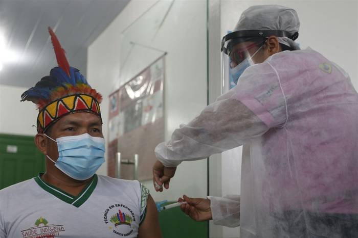 2021年1月19日,医护人员在巴西亚马孙州塔巴廷加市为一名原住民接种中国新冠疫苗。