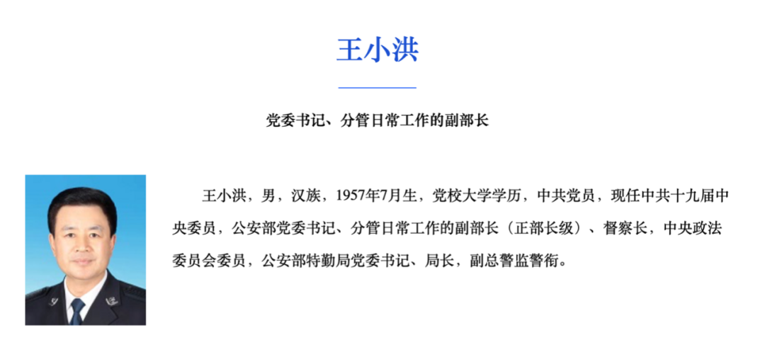 据公安部官网介绍,王小洪,男,汉族,1957年7月生,党校大学学历,中共党员,现任中共十九届中央委员,公安部党委书记、分管日常工作的副部长(正部长级)、督察长,中央政法委员会委员,公安部特勤局党委书记、局长,副总警监警衔。