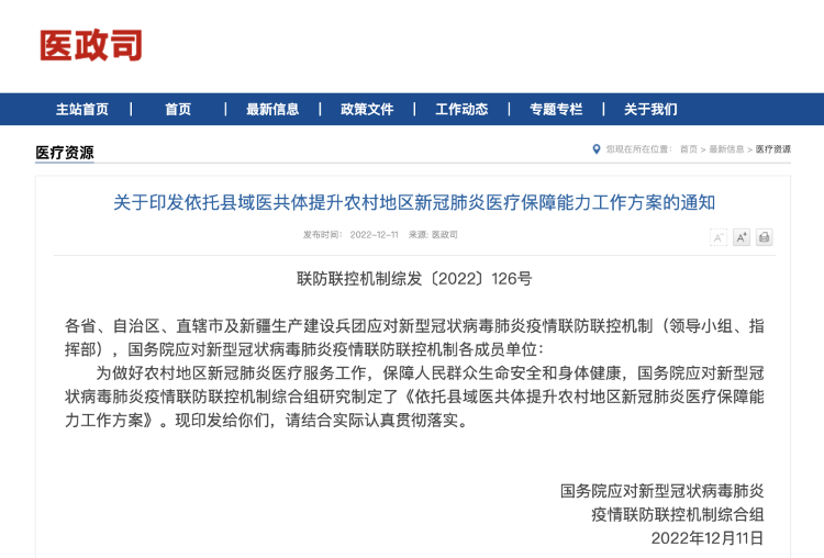 为做好农村地区新冠肺炎医疗服务工作,保障人民群众生命安全和身体健康,国务院应对新型冠状病毒肺炎疫情联防联控机制综合组研究制定了《依托县域医共体提升农村地区新冠肺炎医疗保障能力工作方案》。现印发给你们,请结合实际认真贯彻落实。